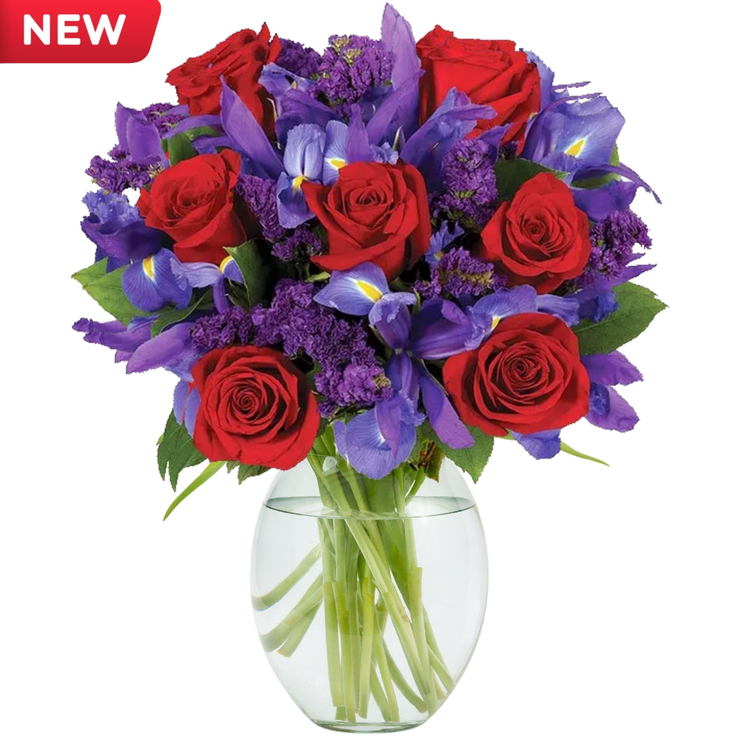 Thinking about sending romantic vibes to someone who’s caught your eye? This striking bouquet of deep red roses paired with vibrant purple irises and delicate statice is sure to stir feelings of love and admiration.